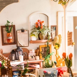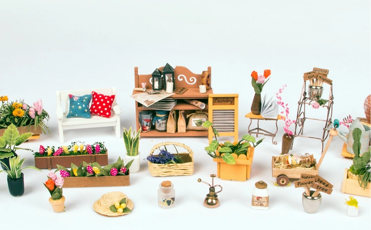 Миниатюрни цветя, мебели, възглавници и аксесоари създават правдоподобна атмосфера на градинска тераса – идеална като стилна декорация за дома.