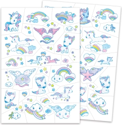 Разпалете детското въображение с вълшебните татуировки DJECO. Комплектът съдържа 2 листа 21 × 14 cm, пълни с еднорози, дъги и облачета. Нанасянето е бързо и лесно с вода, татуировките са дерматологично тествани и подходящи за деца от 3 години.