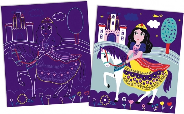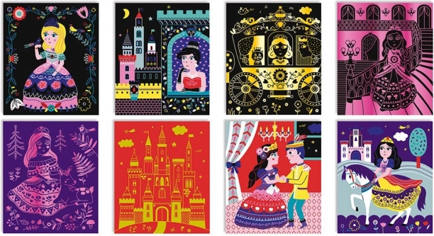 Този елегантен скраб комплект превръща всеки щрих с дървения стилус в очарователна картина с принцеси – от бал, през езда, до стълбите на палата. Децата издраскват горния слой на картите и разкриват ярки цветове и блестящи златни детайли, които оживяват пред очите им.