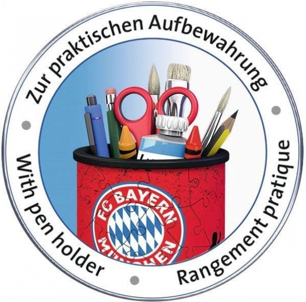 Популярната марка RAVENSBURGER представя дизайнерска 3D поставка с клубен мотив на FC Bayern Мюнхен. Специално оформените и номерирани части от здрав пластмаса прецизно се напасват и създават стабилен органайзер, който ще радва всеки ден. Може да се подрежда или по мотива, или по