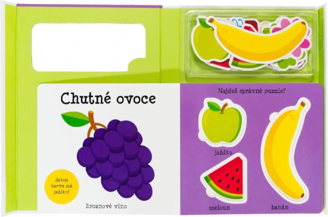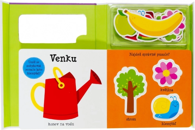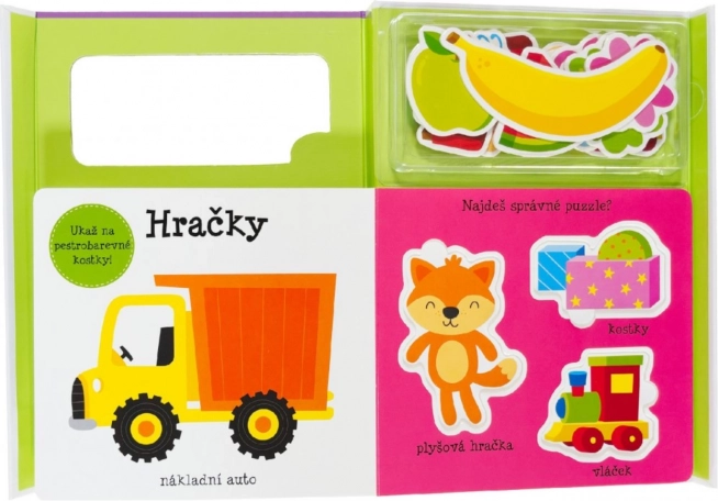 Този комплект е перфектен избор за малки деца, които учат нови думи и подобряват фината си моторика. Весело илюстрираната книжка показва на децата света на основните думи, цветовете, плодовете и животните. Освен това: