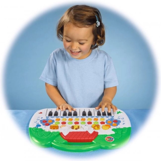 Подарете на децата музикално забавление с интерактивното пиано с животни. Благодарение на осемте звука на музикални инструменти и шестте животински звука, децата лесно ще се запознаят със света на музиката и звуците. Пианото предлага и осем весели мелодии, светлинни ефекти и интуитивно управление, които насърчават креативността и развиват моториката.