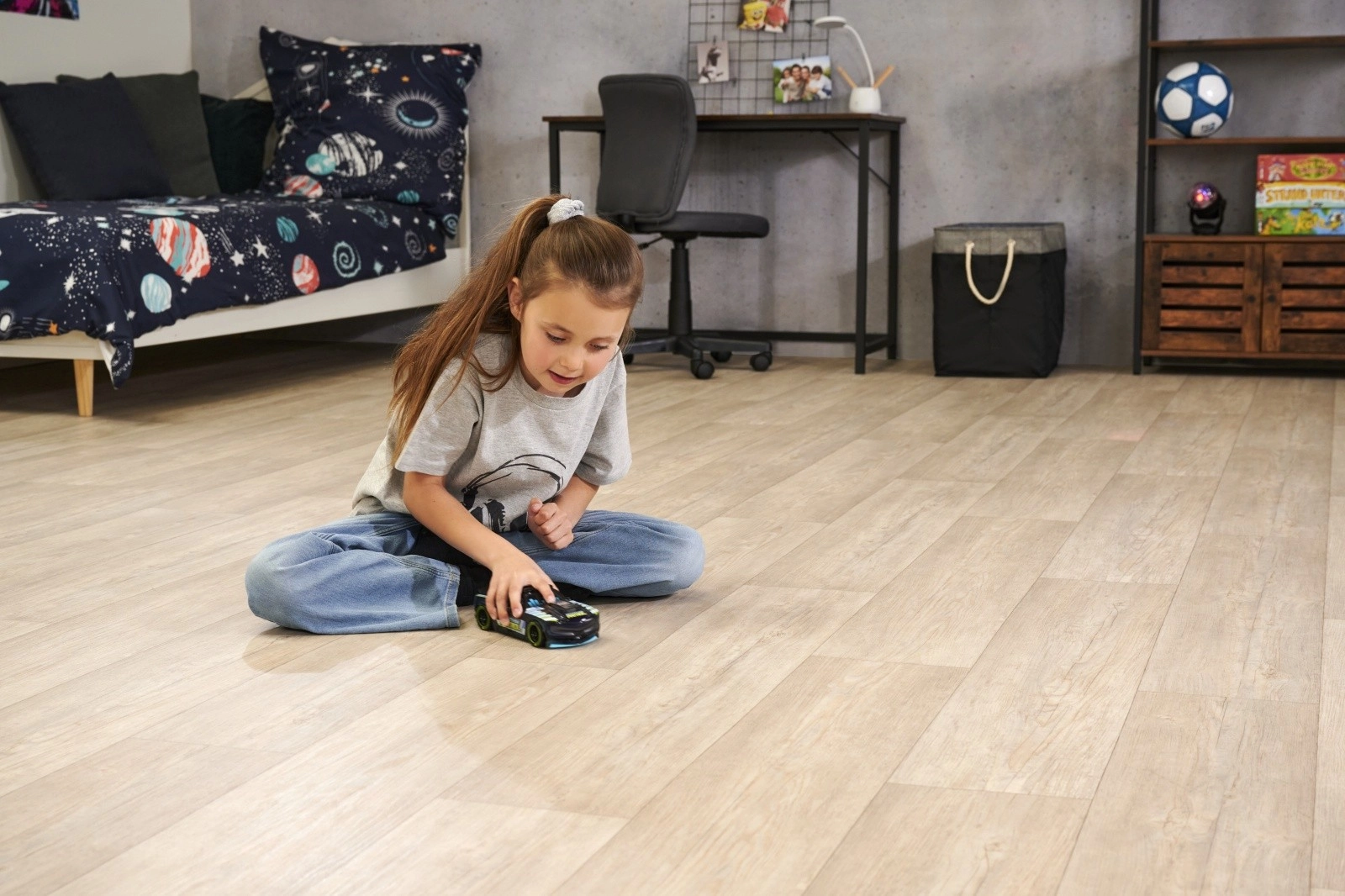 Достатъчно е да издърпате колата по пода и да я пуснете – тръгва без батериен мотор, идеална за бърза и интуитивна игра.
