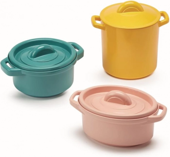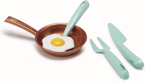 Комплектът включва богата гама пъстроцветни тенджери и тигани, които стимулират любопитството на малките готвачи.
