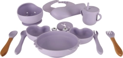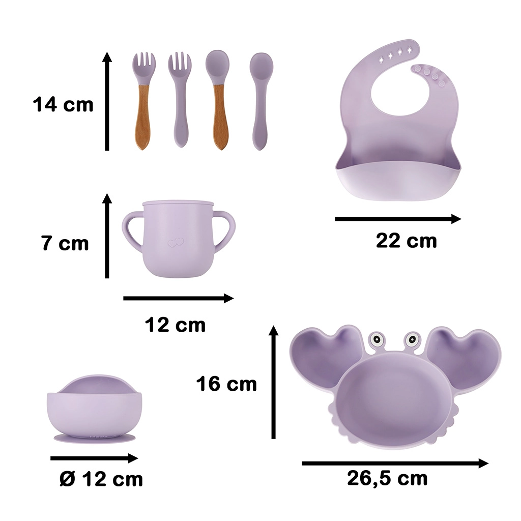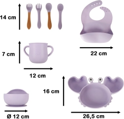 Пълен 9-частов силиконов комплект за първите самостоятелни похапвания. Съдържа чиния във формата на рак, купичка с вендуза, тренировъчна чаша с две капачки и сламка, прибори и практична лигавник. Всичко е от безопасен силикон без BPA, с незалепващи вендузи и лесна поддръжка за чисто и удобно хранене на малките лакомници.