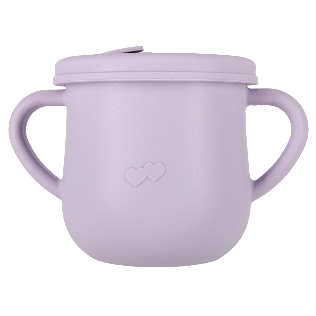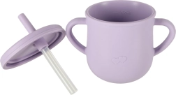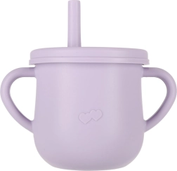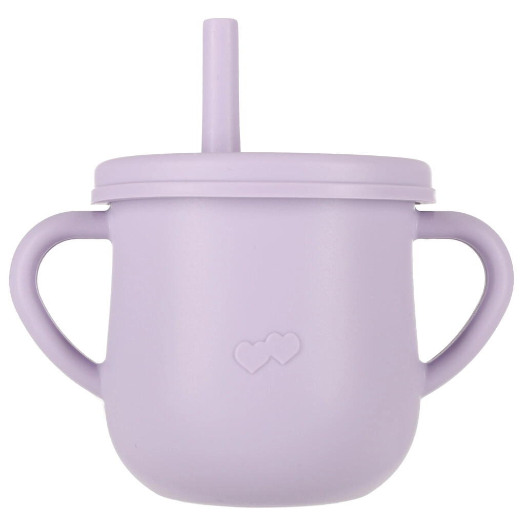Тренировъчната чаша с две дръжки, две капачки и сламка помага на децата да се учат да пият самостоятелно; вътрешните деления улесняват дозирането.