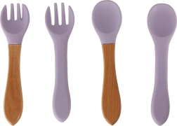 - Приятни материали: мек силикон + дървени дръжки на приборите