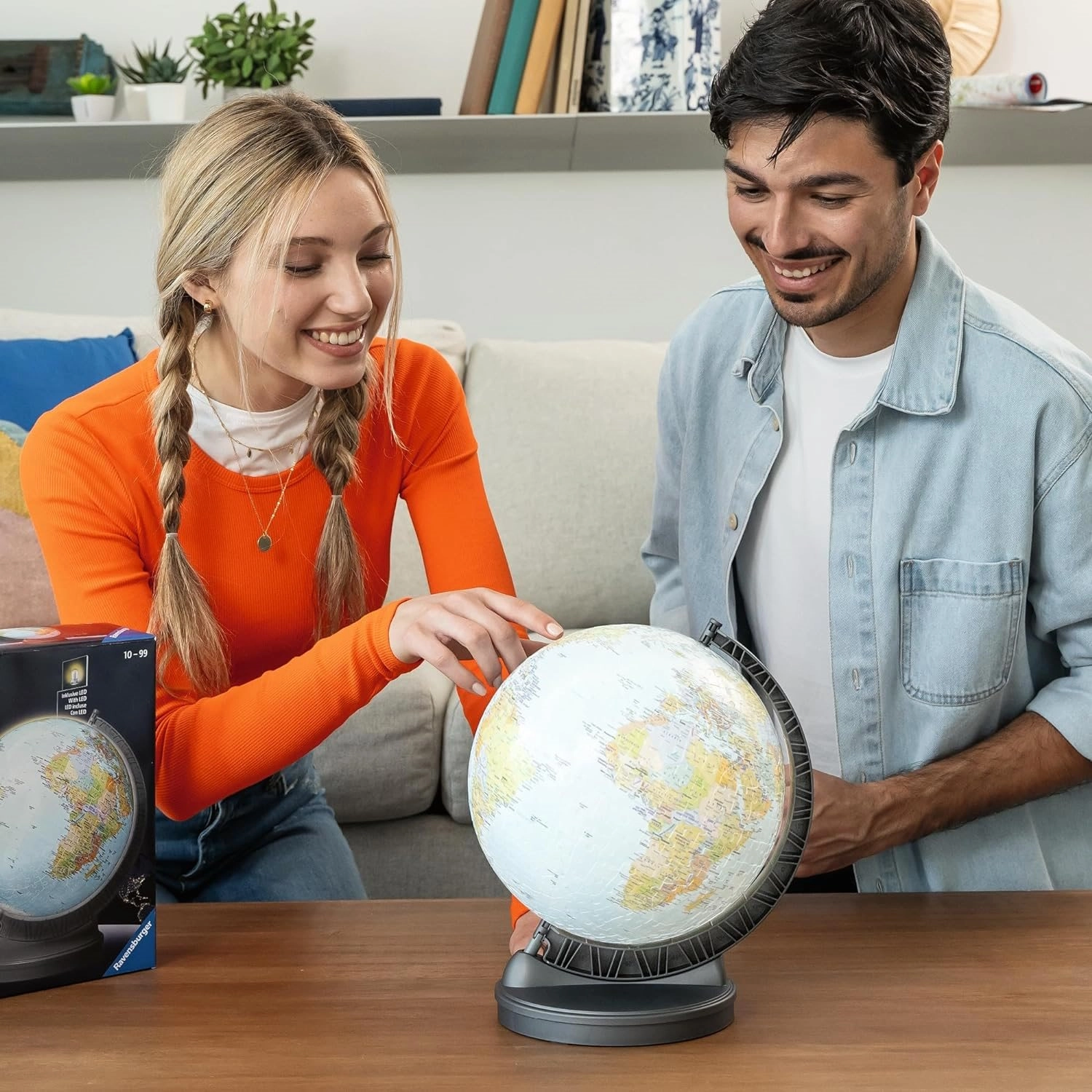 Този премиум 3D пъзел глобус с диаметър 22 cm се състои от 540 здрави, леко извити пластмасови части, които пасват безупречно. След сглобяване образуват гладка и стабилна сфера, поставена на стабилна основа с отбелязани географски ширини. Благодарение на интегрирания LED модул глобусът свети впечатляващо и се превръща едновременно в декорация и обучителен инструмент.