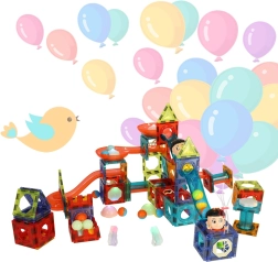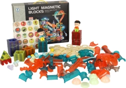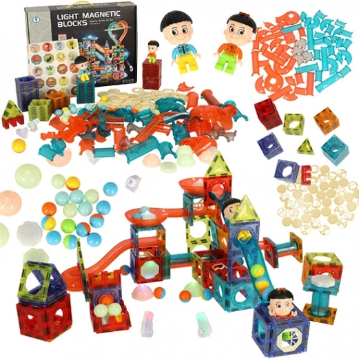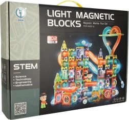 Този креативен STEM конструктор комбинира магнитни елементи и прозрачни писти за топчета. Светлинните елементи и „рефлектори“ озаряват всяка конструкция и превръщат играта във впечатляващ светлинен ефект – особено красив в тъмнина. Частите са от издръжлива пластмаса, магнитните връзки осигуряват стабилност, а тунелните секции се фиксират здраво.