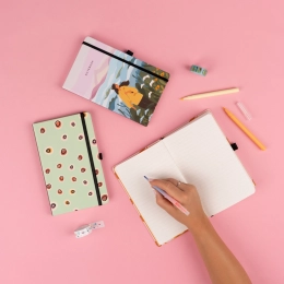 Насладете се на писането с този изискан бележник с размер 13 x 21 cm, който ще ви очарова със стилния си дизайн. Твърдите корици с еластична лента за затваряне гарантират, че бележките ви остават безопасно прибрани вътре. Вътрешният капацитет от 172 страници жълта хартия предлага достатъчно място за вашите идеи, бележки или скици. Практичността се допълва от държач за химикал и заден джоб за дребни вещи.