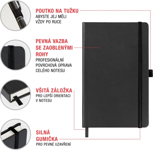 Здравата твърда подвързия защитава вашите бележки, а еластичният ластик ги държи надеждно събрани при ежедневна употреба. Практичната лента за молив/химикал допълва общия комфорт.
