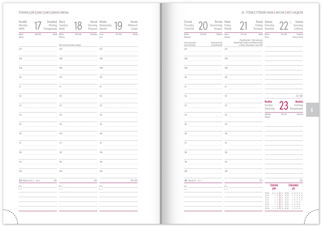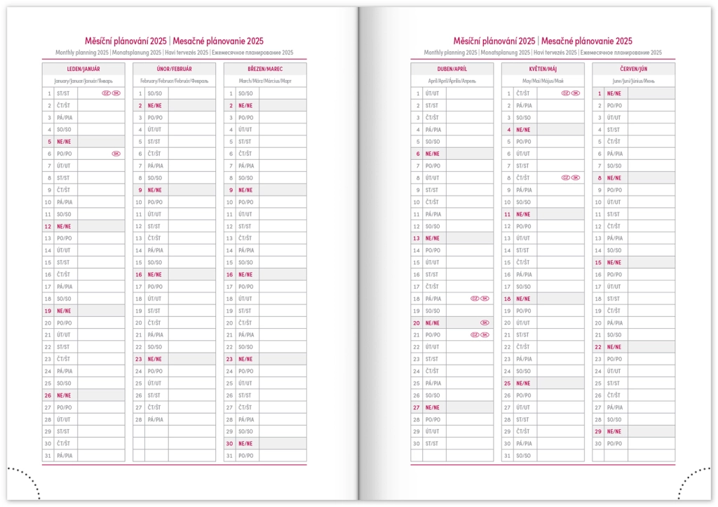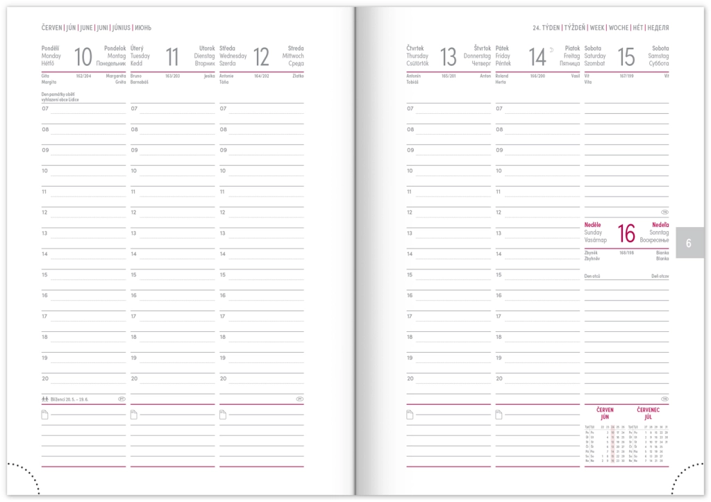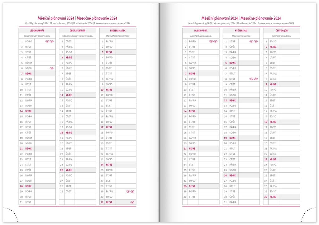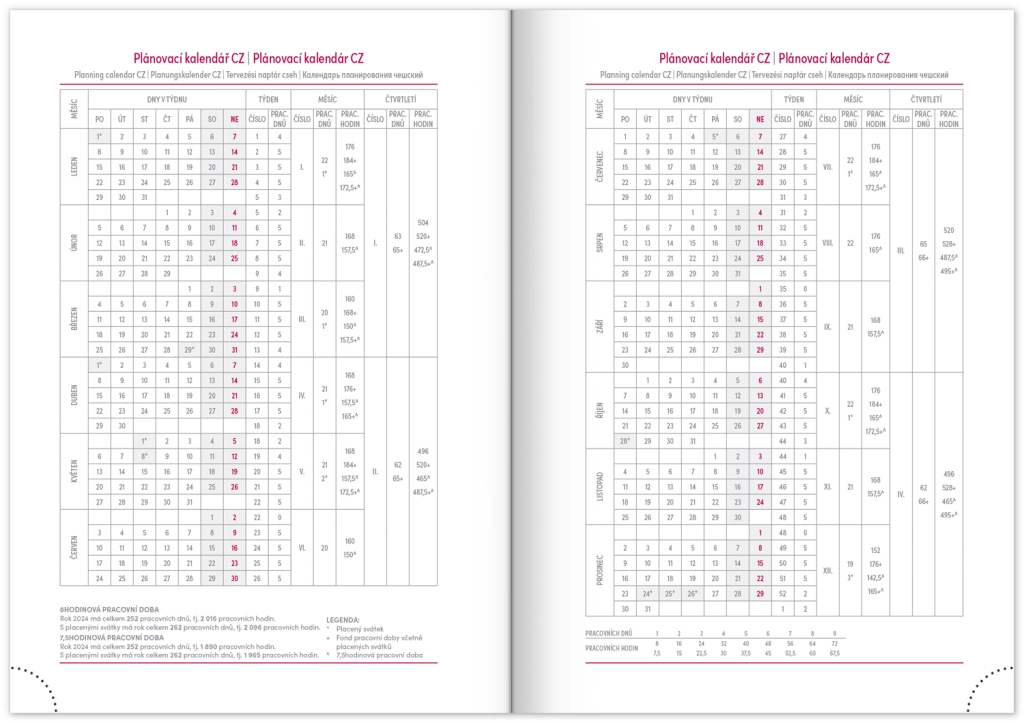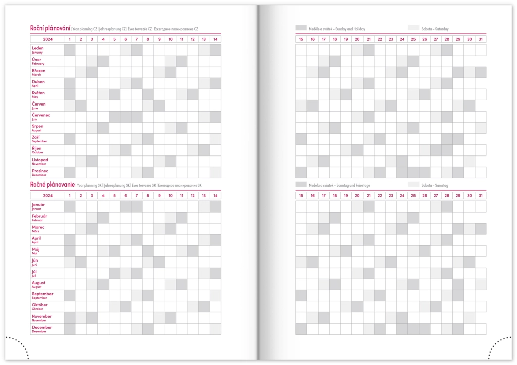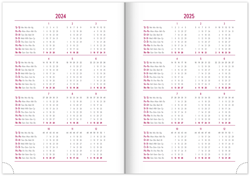 Седмичен дневник Capys 2024 в елегантен червен цвят предлага структурирана платнена повърхност, идеална за преге през фолио. Съдържа седмичен разпис с чешко-словашки календар, допълнен с английски, немски, унгарски и руски.