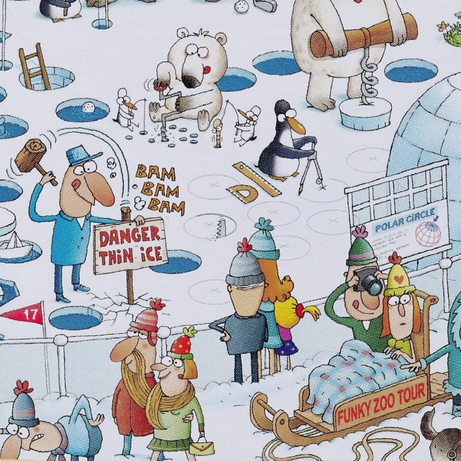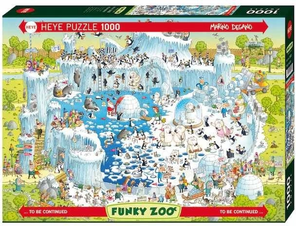 HEYE Пъзел Луда ЗОО: Полярна експозиция предлага чудесна възможност да създадете свое собствено животинско царство у дома с хиляди части. Страхотно забавление, проектирано от признатия карикатурист Марино Дегано, което гарантира усмивка, докато търсите отделните елементи.