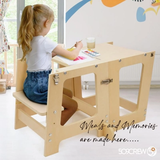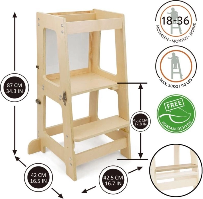 Обучителната кула Prema 3в1 е изработена от висококачествен и издръжлив шперплат, който предлага лесно сглобяване и дълъг живот. Разполага с 2 нива на височина (16,5 cm и 22,5 cm), за да се адаптира лесно към растежа на вашето дете.