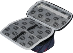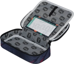 Здравият пенал тип etue с падаща преграда поддържа писмените принадлежности подредени. Не липсват вътрешен джоб с цип и разписание; пълнежът не е включен. Торбичката за обувки или физкултура е от издръжлив, лесен за почистване материал, а стягането със здрави връзки позволява удобно носене на гръб.