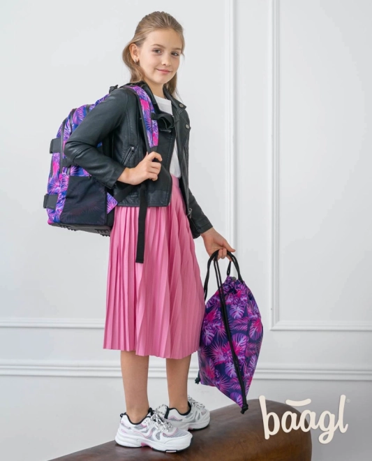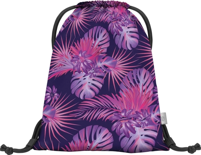 Торбичката има атрактивен тропически мотив в розови и лилави тонове, който привлича вниманието.