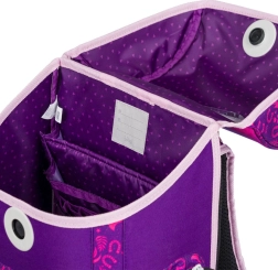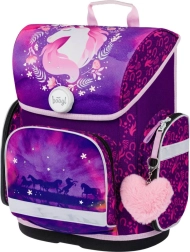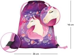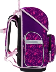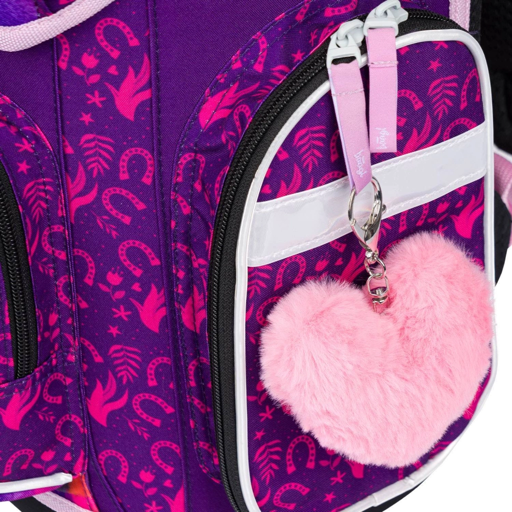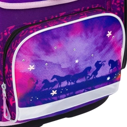 Стилен училищен комплект с конски мотив за малки ученици от 1. клас включва ергономична раница, просторен несесер и практична торбичка за обувки. Раницата предлага ергономично оформен гръб и плъзгаща се система ERGO ADJUSTABLE SYSTEM за перфектно напасване, магнитно закопчаване Fidlock за лесно отваряне, рефлекторни елементи за безопасност и ниско тегло под 1 200 g. Комплектът се отличава с висококачествена изработка, водоустойчиви материали и красив лилаво-розов дизайн с конски мотиви.