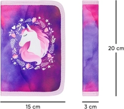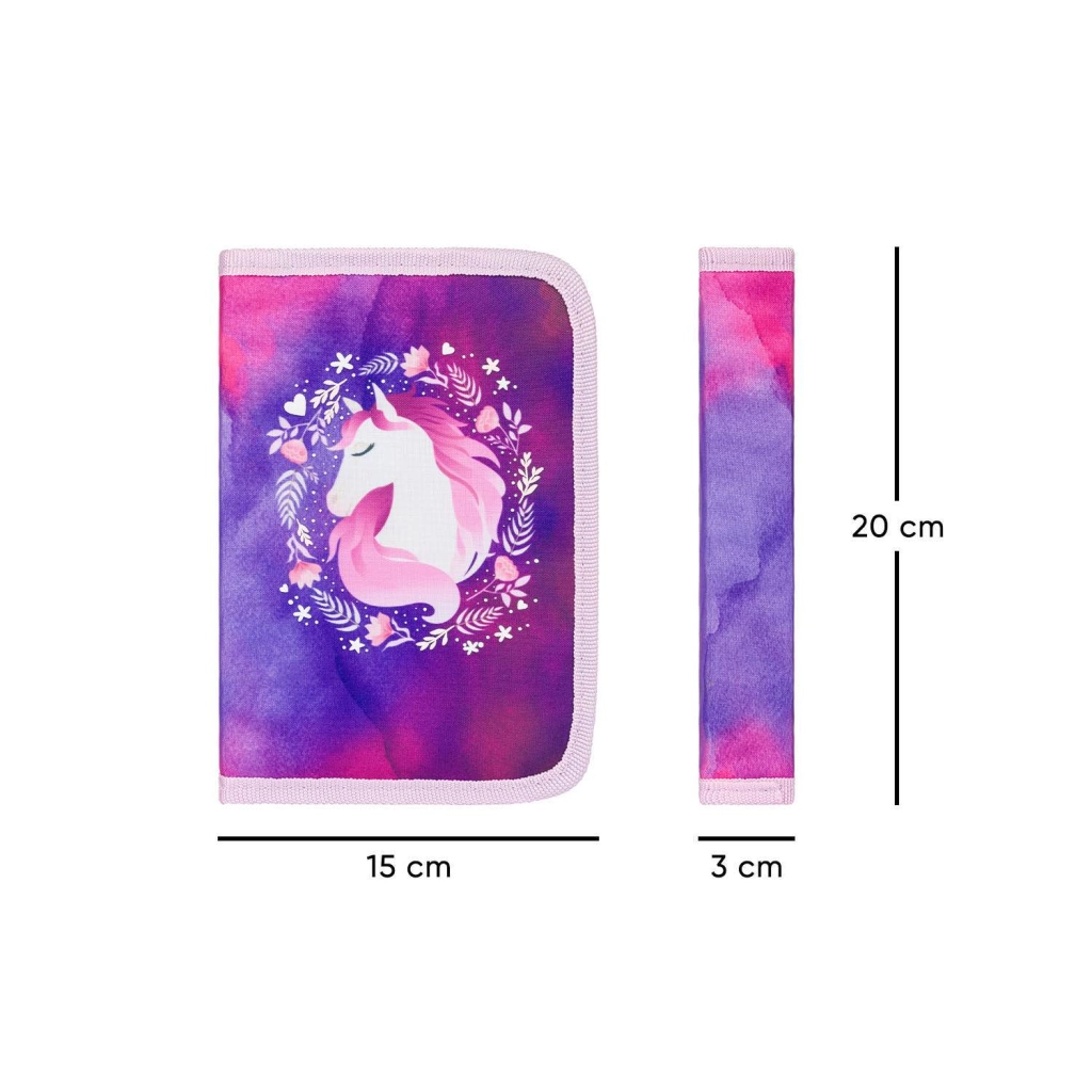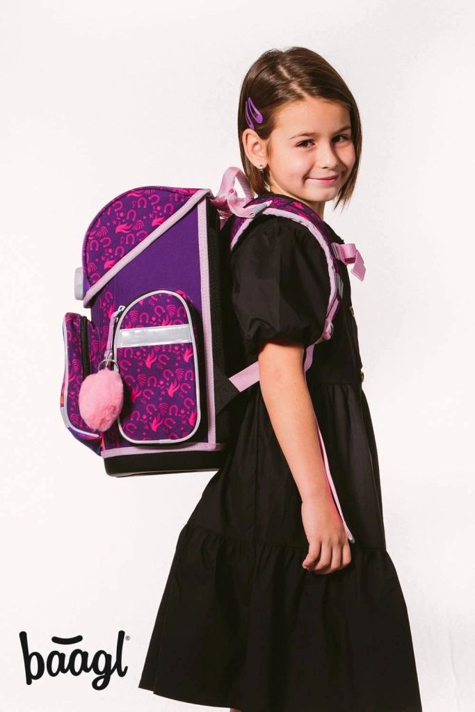 Пълният училищен комплект BAAGL с конски мотив е идеален избор за първите училищни години. Ергономичната раница със стабилна форма и регулируема гръбна система гарантира здравословно носене, а обмисленото вътрешно разпределение поддържа ред в учебните принадлежности. Несесерът с две клапи предлага място за моливи и пастели, а торбичката за обувки е чудесна за чехли или за извънкласни дейности.