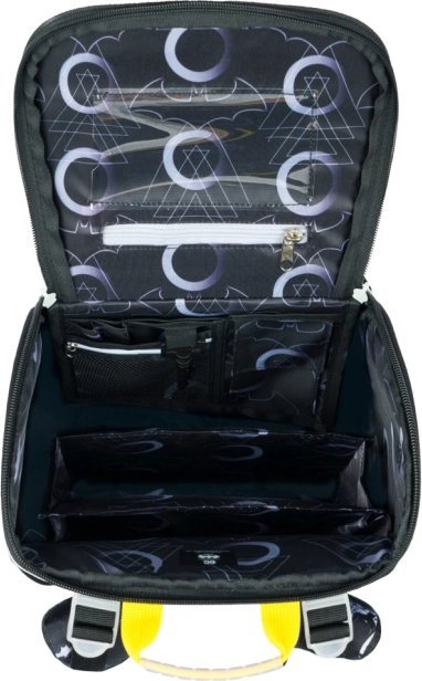 Практичното отваряне с капак нагоре осигурява достъп до съдържанието директно от чина. Вътре ще намерите прозрачен джоб за разписание и органайзер с фиксираща ластична лента за подредено съхранение на учебници и тетрадки. Изолираният преден джоб със закопчалка пази закуската, страничните мрежести джобове побират бутилка за вода. Здравите водоустойчиви материали, стабилното дъно и светлоотразителните елементи повишават издръжливостта и безопасността по пътя до училище.