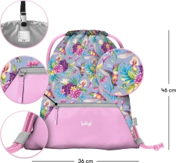Практична спортна торбичка Baagl с мотив колибри, идеална за пантофи, обувки и свободното време. Има издръжлив и миещ се материал, практичен преден джоб с цип и здрави връзки за лесно носене на гръб. Благодарение на карабинера лесно я закрепвате към ученическата раница.