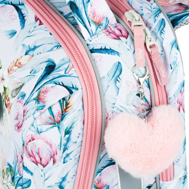 Здрава конструкция защитава съдържанието и осигурява стабилност. Благодарение на множеството светлоотразителни елементи детето е добре видимо по пътя към училище. Раницата е оборудвана и със стилен пухкав ключодържател, който добавя модерен акцент.