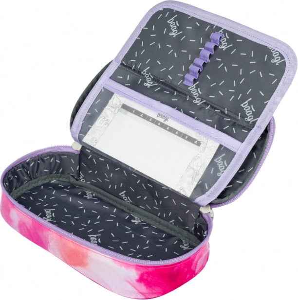 Пеналът предлага вътрешна разгъвaема преграда, джоб с цип и място за разписание, което улеснява организацията на всички учебни принадлежности.