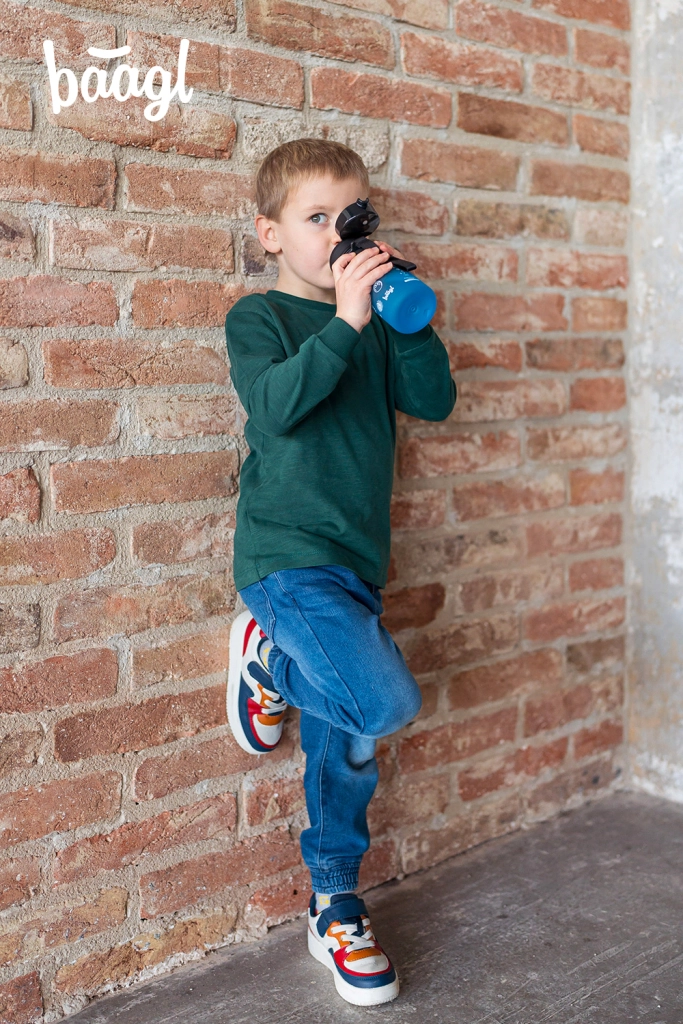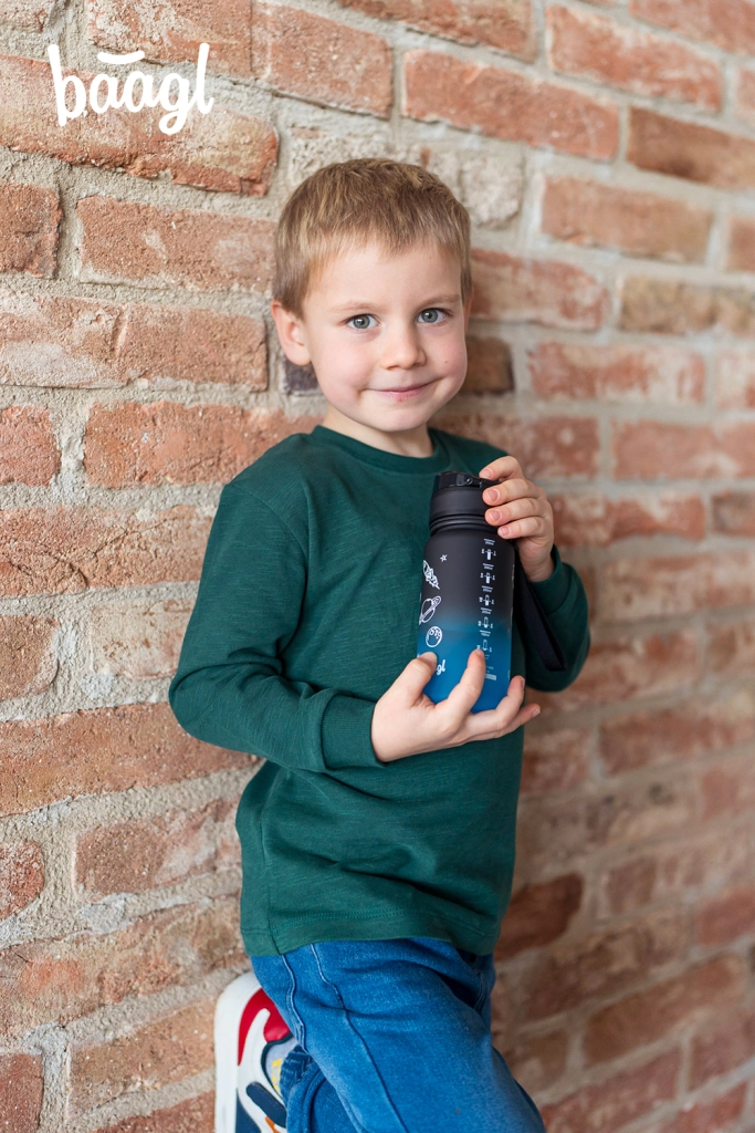 Тази тританова бутилка BAAGL с обем 350 мл в атрактивен градиент от черно към синьо е надежден спътник за ежедневния хидратиращ режим. Заключващият се капак предотвратява нежелано изливане и позволява бързо, интуитивно отваряне с една ръка. Благодарение на вграденото сито ще се насладите на вода с плодове и насипни чайове – материалът е подходящ и за горещи напитки.