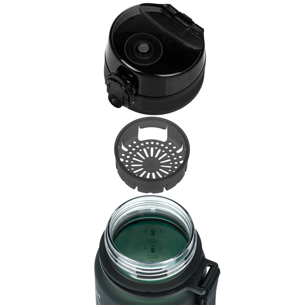 Включена е подвижна цедка, подходяща за вода с плодове, билкови настойки и чай. Практичната каишка улеснява носенето в движение, а благодарение на компактните размери бутилката се побира без проблеми в раницата. Използвайки бутилка за многократна употреба, допълнително намалявате потреблението на еднократни PET и щадите околната среда.
