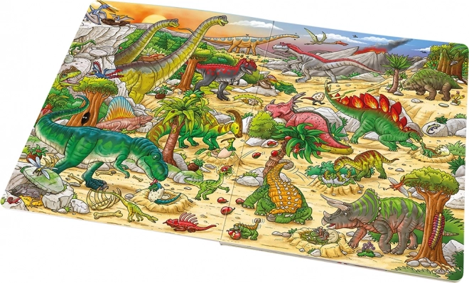 На всяка страница ще откриете подробни, красиво оцветени илюстрации, изпълнени с праисторически създания, и забавни задачи за наблюдателност: някои гущери трябва да бъдат търсени отново и отново. Книгата е написана разбираемо за деца и накрая предлага пълен списък с имената на изобразените динозаври.