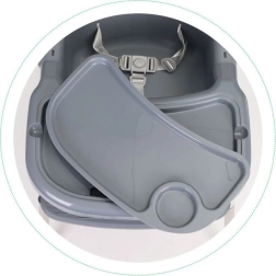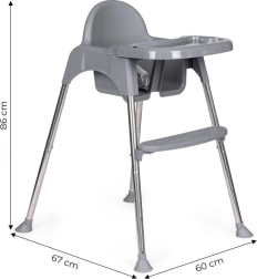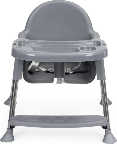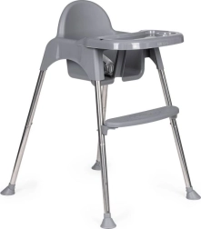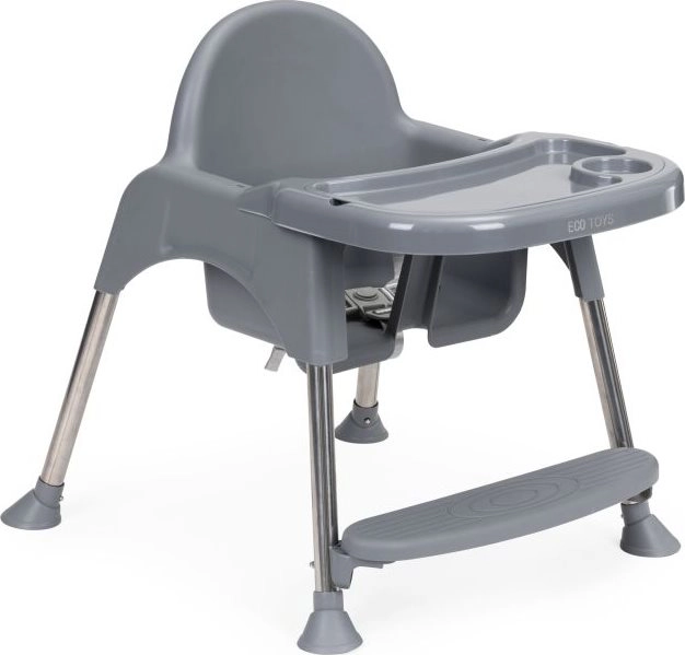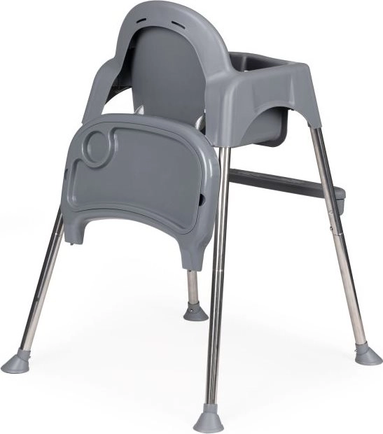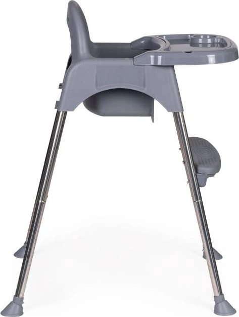 Благодарение на умното решение лесно превръщате високото столче в по-ниско кресло – просто отвивате част от краката и поставката за крака. Подходящо е не само за хранене, но и като безопасно място за рисуване и творене без притеснение от изцапване наоколо. Металните крака с неплъзгащи пети пазят пода и осигуряват стабилност, 3-точковите колани и ограничителят срещу плъзгане повишават безопасността.