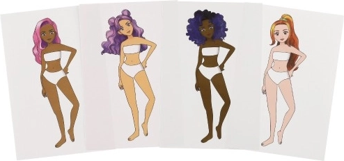 В опаковката ще откриете 8 различни моделки, 2 листа шаблони за облекло и 12 цветни самозалепващи фолия. Готовите дизайни могат допълнително да се украсят с аксесоари за още по-изразителна визия. Комплектът развива въображението и предлага часове творчество без бъркотия.