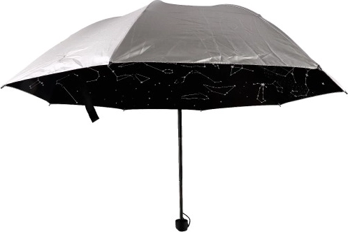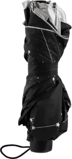 Стилен сгъваем чадър със сребърна външна повърхност и вътрешен мотив със съзвездия, който съчетава лекота, компактни размери и надеждна защита от дъжд. Благодарение на дължина само 25 см в сгънато състояние лесно се побира в чанта или раница и е идеален за ежедневна употреба.