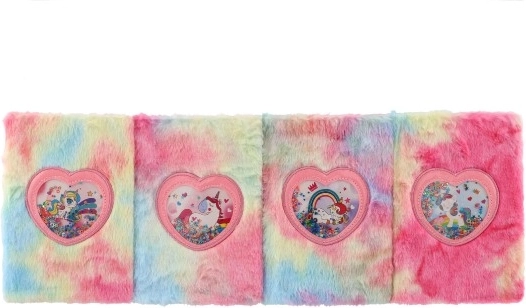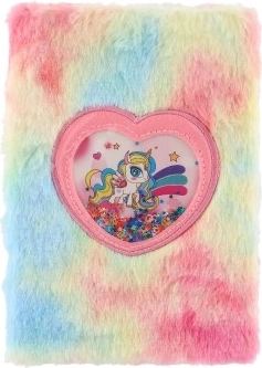 Насладете се на писане и творчество с този стилен тефтер в дъгово плюшено изпълнение. Меката повърхност е приятна на допир, а сърцевидното прозорче с пайети и мотив на еднорог придава на обложката игрив, магичен вид. Тефтерът е чудесен за училище, свободното време и като личен дневник.