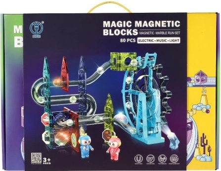 Този цветен конструктор позволява на децата лесно да свързват магнитни елементи и да създават оригинални писти за топчета. След построяване на трасето идва напрежението – ще стигнат ли топчетата от старта до финала? За безопасното пристигане следят и симпатичните фигурки Нинк и Уинк. Интегрираното електрическо колело служи като асансьор за топчетата и добавя светлинни и музикални ефекти, които при нужда могат да се изключат.