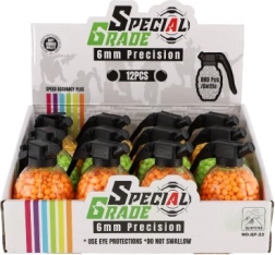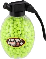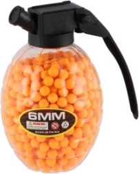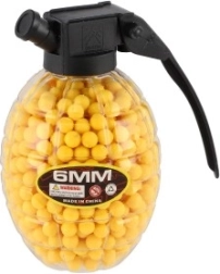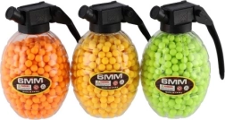 Допълнете екипировката си с практична опаковка топчета в оригинална кутия във форма на граната. Вътре ще намерите 800 гумени топчета 6 мм, които благодарение на ярките цветове се откриват и следят лесно. С удобната капачка ще допълните пълнителя бързо и без бъркотия.