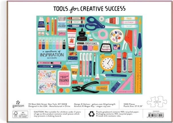 Пъзел Galison Креативни Инструменти предлага красиво представяне на творчески пособия. Сглобяването на 1000 части осигурява не само забавно предизвикателство, но и усъвършенства фината моторика. Всеки елемент е прецизно изрязан, което гарантира лесно подреждане и здраво свързване.