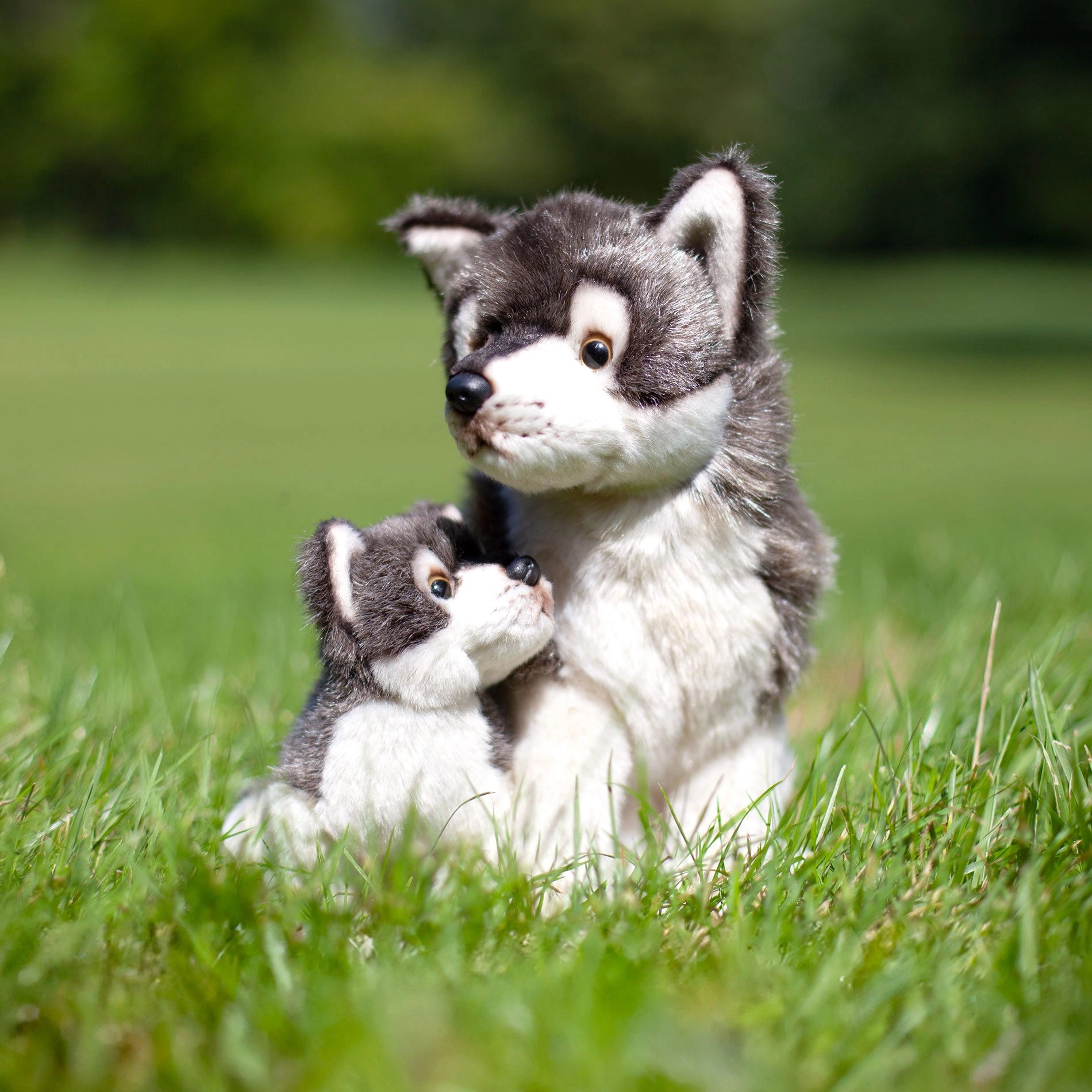 Този седящ вълк с малко от марката Rappa е изработен от ексклузивен, на допир копринено мек плюш, който приканва към гушкане. Пълнежът е от рециклирани PET бутилки, за да се наслаждавате на забавление, щадящо природата. Малкото е свързано с възрастния вълк само с конец – лесно се отделя и така получавате две самостоятелни играчки.