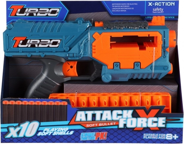 Blaster Turbo mini е компактен и мощен игрови бластър с обсег 8–15 метра, който предлага висока точност и безопасно стрелба благодарение на меките пянови снаряди.