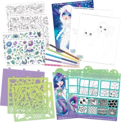 Част от комплекта е богато съдържание за креативно творчество: стикери, шаблони, текстури и качествени двустранни моливи. Приложените примери за техники и основната теория на цветовете помагат за подобряване на уменията за рисуване и подкрепят самоизразяването.