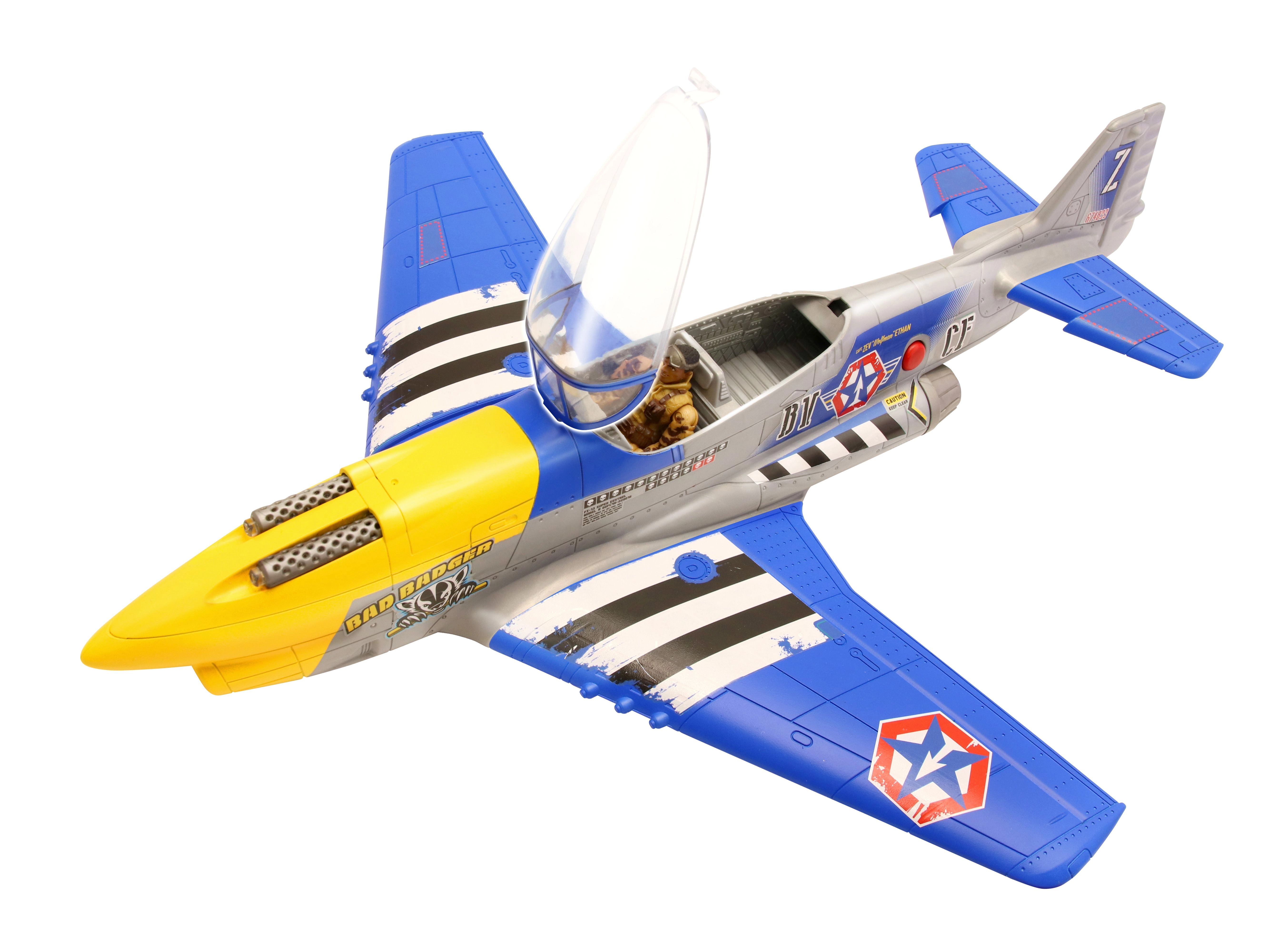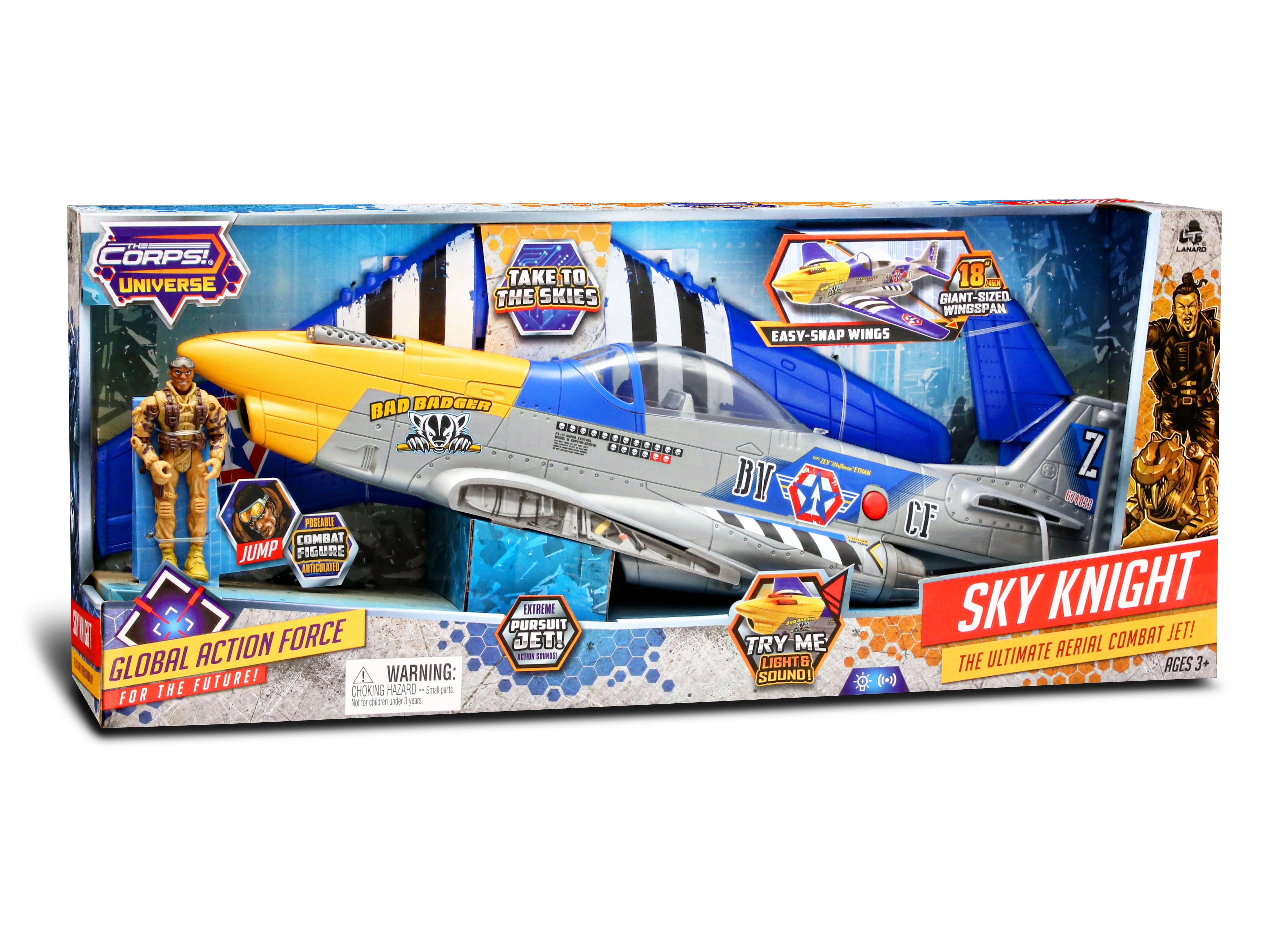 Насладете се на екшън въздушни приключения с модела The Corps Sky Knight! Този детайлно изработен самолет с дължина 51 см и размах 46 см предлага светлинни и звукови ефекти, отваряем кокпит за 2 фигурки и се доставя с войник с височина 10 см. Батерии 2× AA са включени в комплекта, така че забавлението може да започне веднага.