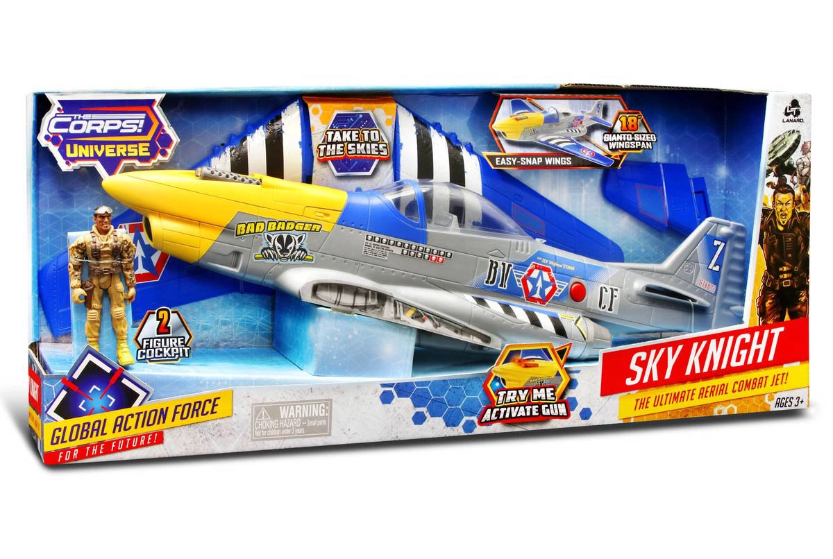 Самолетът The Corps Sky Knight е идеален избор за малки и по-големи фенове на екшън мисиите. Предлага реалистични елементи, здрава изработка и ефекти, които стимулират въображението и ролевата игра. Благодарение на подготвения кокпит за две фигурки децата могат да създадат собствен екип и да тръгнат на опасни мисии.