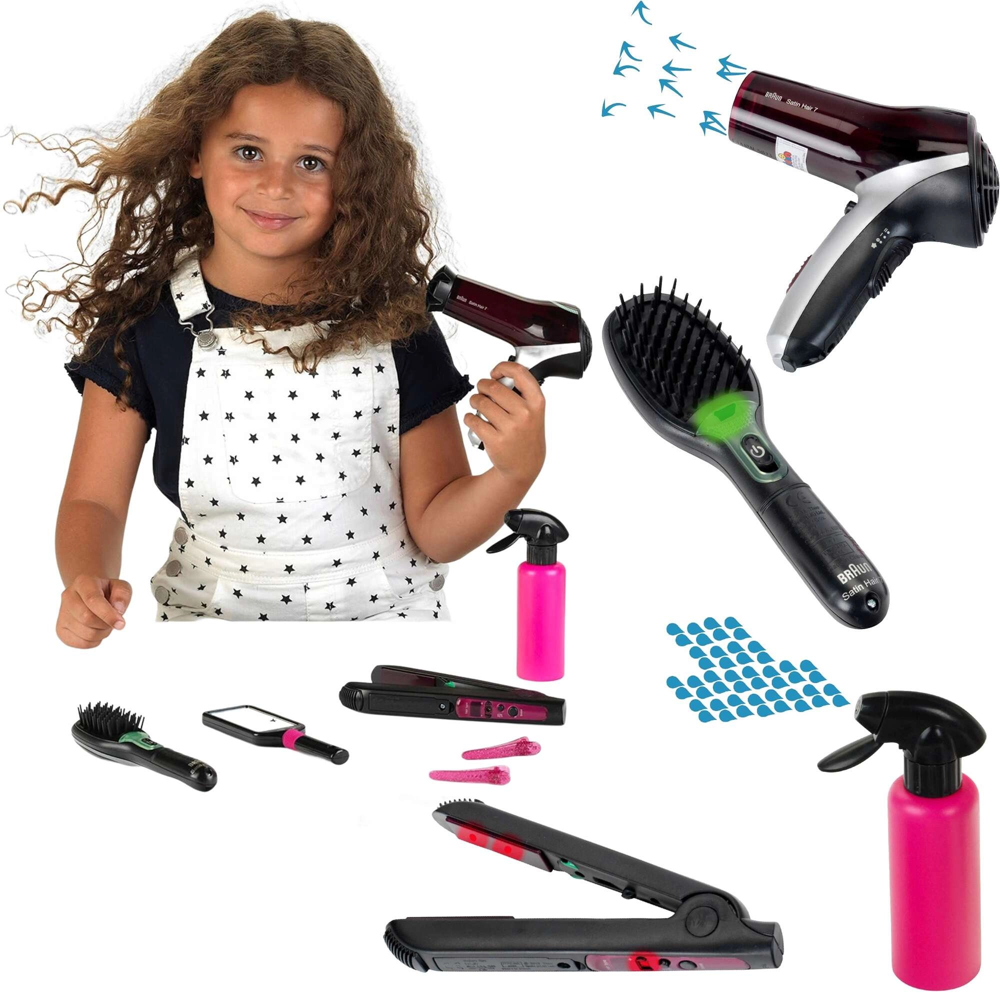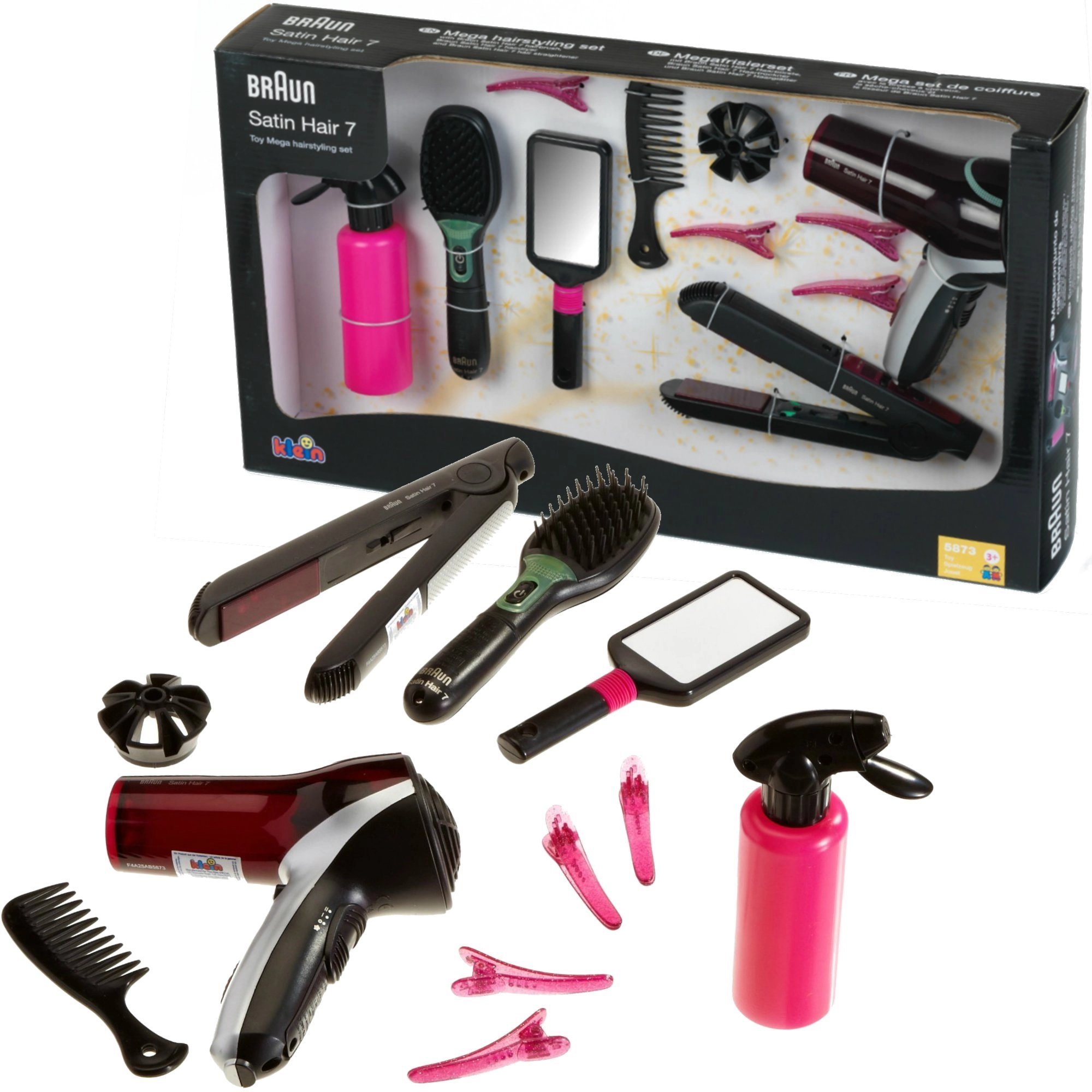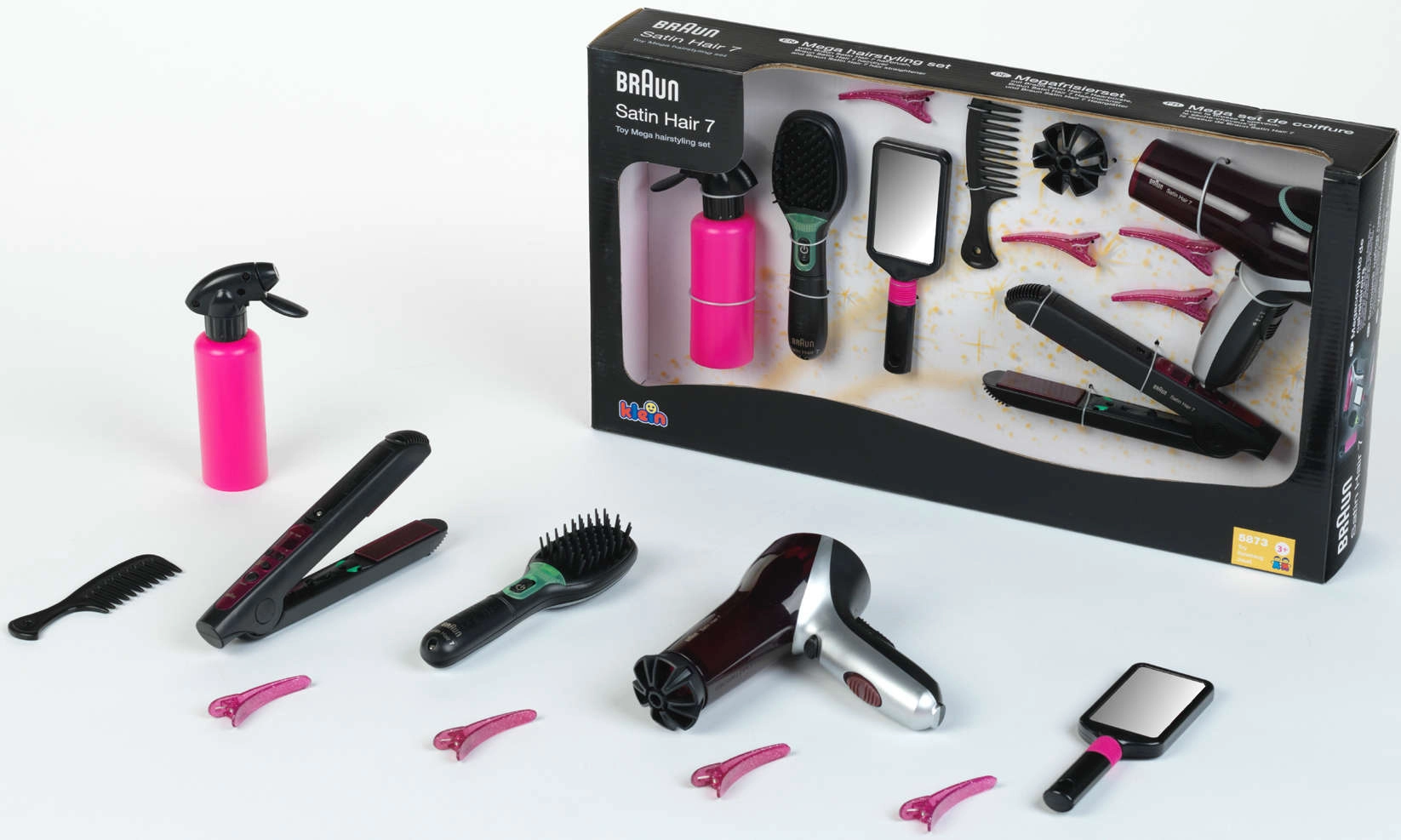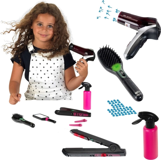 Големият фризьорски комплект, вдъхновен от серията BRAUN Satin Hair, предлага на децата всичко необходимо за стилни прически. Играчките са проектирани с акцент върху безопасността и имитират истински инструменти – сешоарът, пресата и четката работят на батерии и създават реалистични светлинни и звукови ефекти, без да произвеждат топлина или въздушна струя.