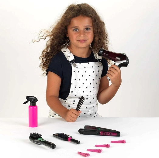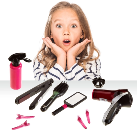 Сешоарът, пресата и четката на батерии създават атрактивни ефекти, които доближават децата до истинските фризьорски инструменти – безопасно и без нагряване.