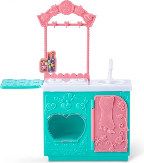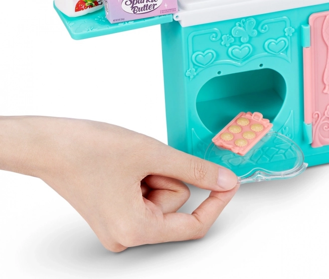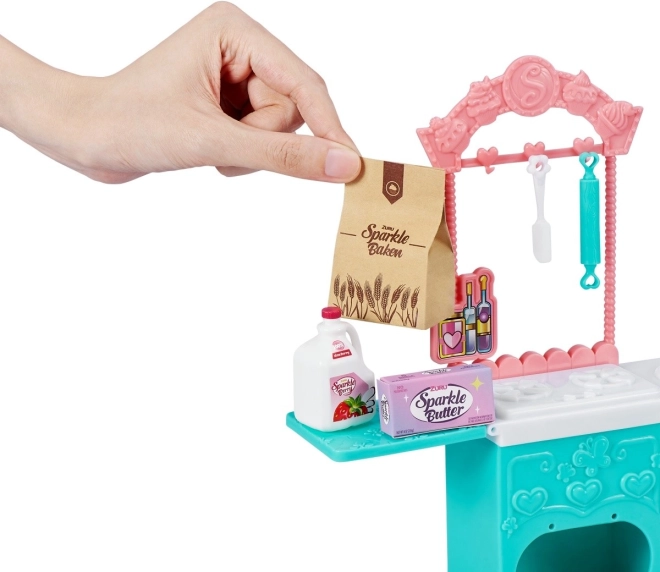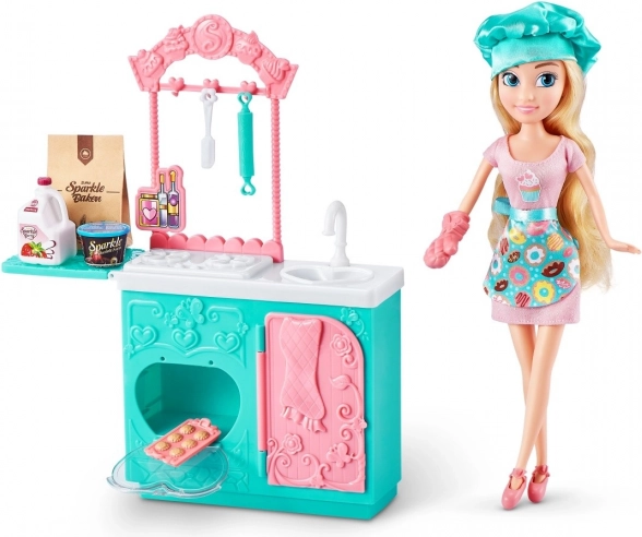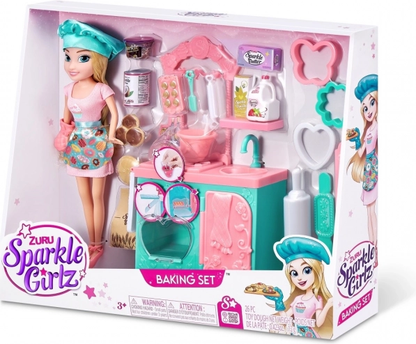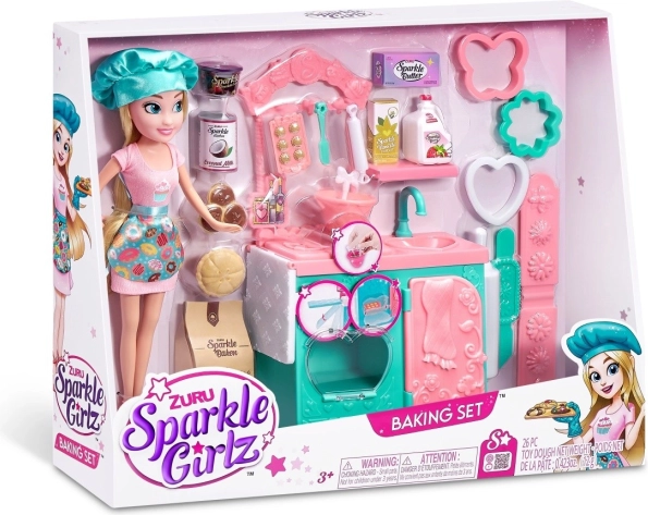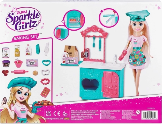 Сетът съдържа необходимите елементи за игра, включително малки играчки-храни, купи, шпатулички и формички, които позволяват реалистично пресъздаване на печене. Отворете фурната, сложете в нея бисквитките и се престорете, че се пекат! Благодарение на сменяемите дрехи куклата може да се комбинира с други фигурки от серията Sparkle Girlz.