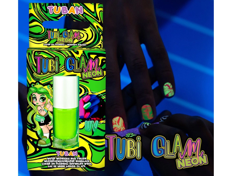 Неоновият лак за нокти TUBI GLAM е създаден специално за малки любители на стила. Осигурява наситен, ярък нюанс и едновременно нежна грижа – съставът му е дерматологично тестван и адаптиран към деликатната детска нокътна плочка. Лакът свети под UV светлина, което го прави идеален за партита, празненства и ежедневни игриви стилове.