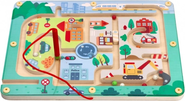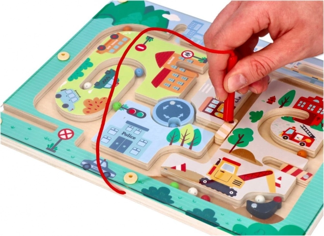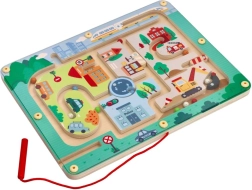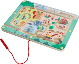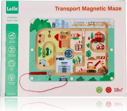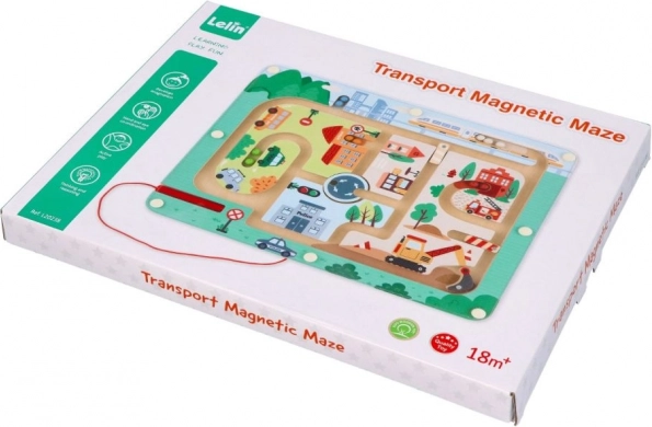 Открийте забавния свят с Магнитния лабиринт Превозни средства, създаден да стимулира мисленето и сръчността на малките ръчички. Тази играчка е изработена от качествено дърво и представя пъстра градска сцена с пътища, сгради и превозни средства. С помощта на червената магнитна пръчица децата водят малки топчета по трасето, което подпомага техните мануални умения и координацията око-ръка.