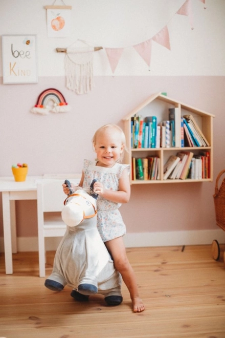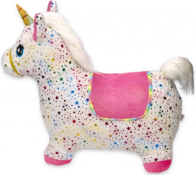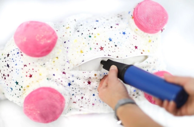 Скачашият еднорог се надува лесно с включената ръчна помпа. Готов за игра за минути – еластично ядро, удобен захват и размери 60 × 50 × 25 cm.
