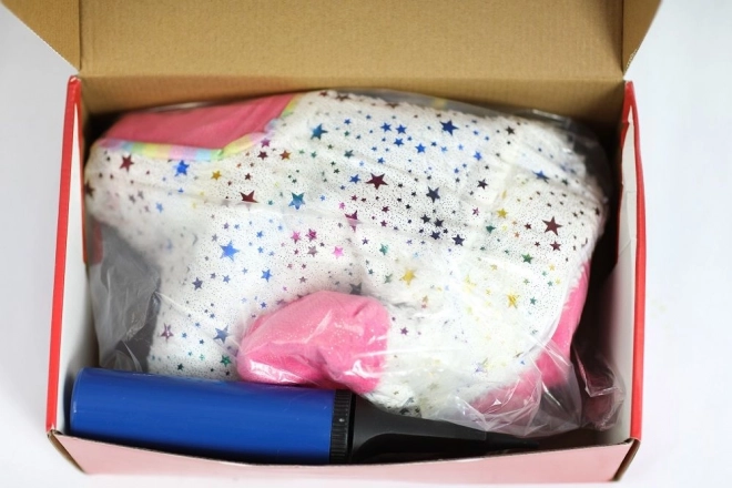 В комплекта има практична ръчна помпа за бързо надуване. Калъфът се сваля лесно с цип и се почиства без усилие. Елегантният дизайн със звездички и розови детайли чудесно подхожда на детската стая и стимулира въображението по време на игра.