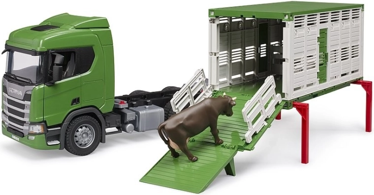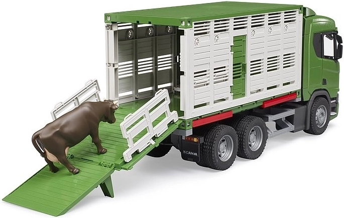 Реалистичният превозвач на животни BRUDER на шаси SCANIA ще зарадва малките фермери с отлични функции и здрава изработка. Предлага падащи и изтеглящи се рампи, отварящи се врати, сгъваеми огледала и вътрешни разделителни врати. Включена е фигурка на крава, меки грайфери на гумите за тиха работа и възможност за добавяне на светлинен и звуков модул за още по-голямо удоволствие от играта.