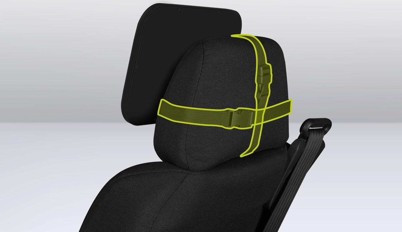 Лесно закрепване към подглавника с помощта на регулируем колан и катарама. Шарнир с 360 градуса позволява свободна настройка на позицията.